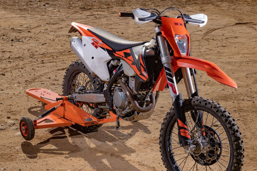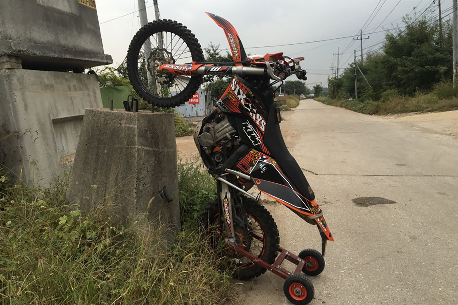 We designed a compact and foldable wheelie machine for dirt bikes, capable of all functions.